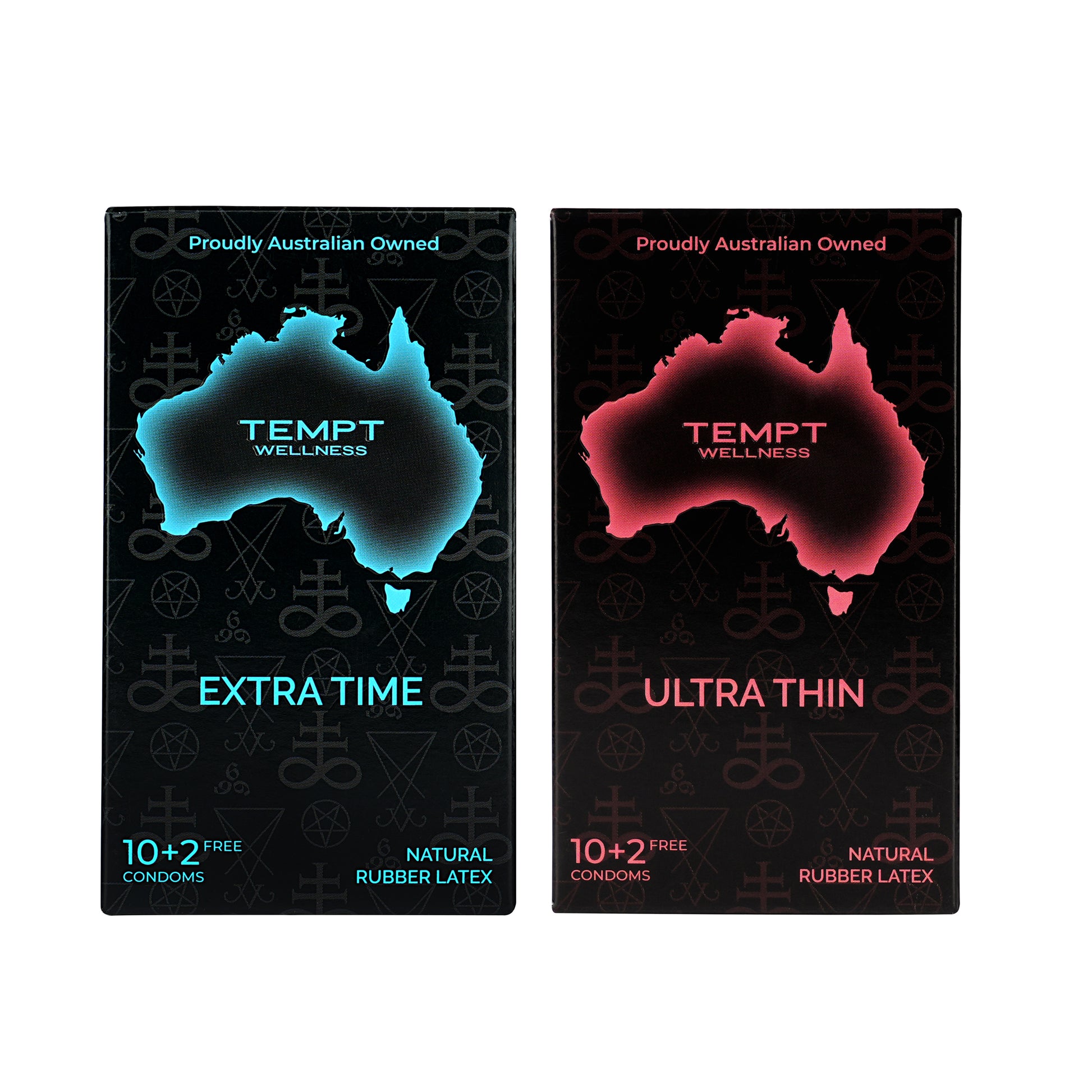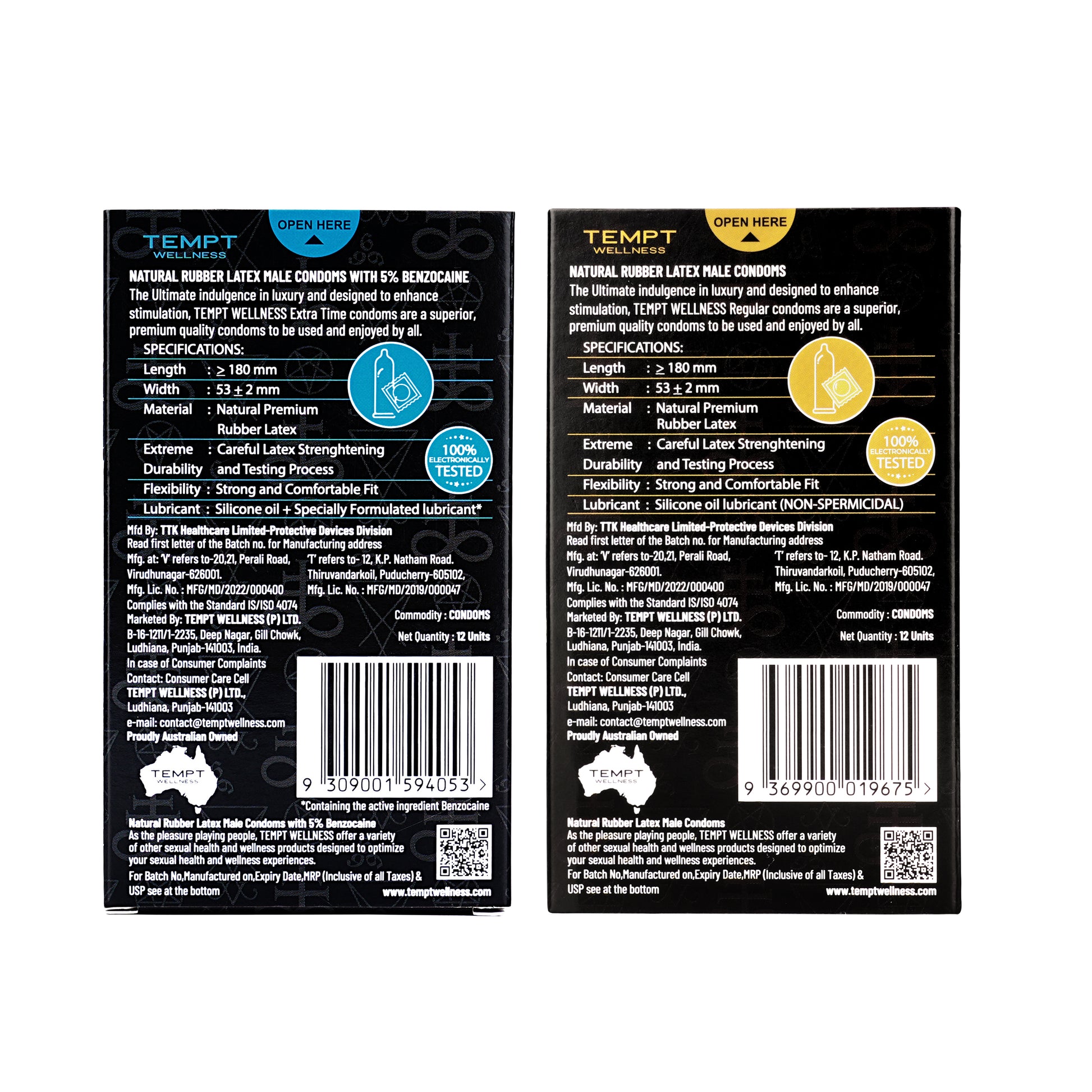 Experience the ultimate combination of prolonged pleasure and heightened sensitivity with Tempt Extra Time and Extra Thin Condoms. This thoughtfully curated combo pack offers 12 Extra Time Condoms, designed to extend your intimate moments, and 12 Extra Thin Condoms, crafted to provide a natural, barely-there feel.